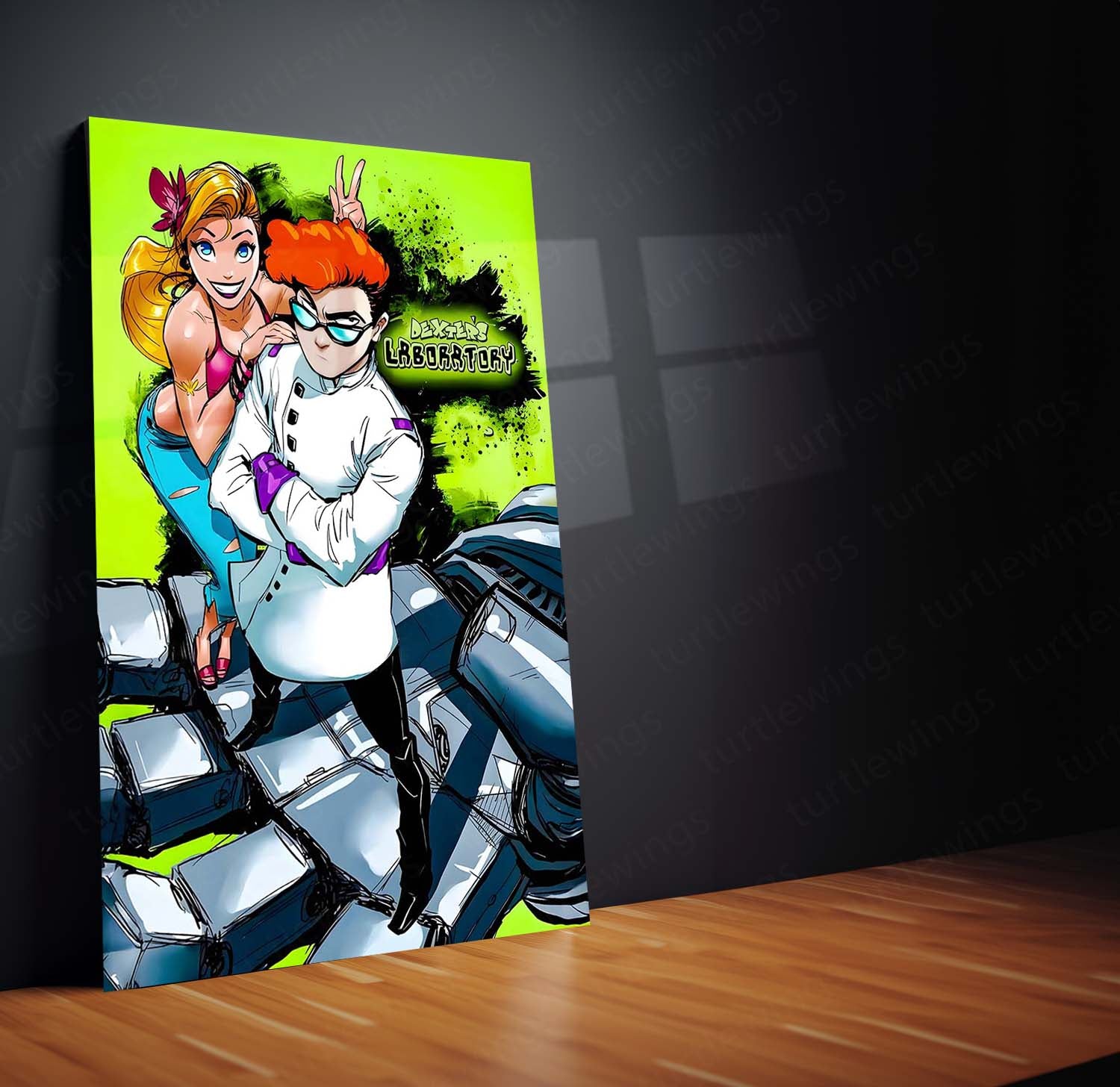dexter’s laboratory poster, retro cartoon wall art, nostalgic metal frame, 90s animation decor, dexter and dee dee artwork, classic cartoon print, pop culture metal art, neon comic wall poster, geek room decor