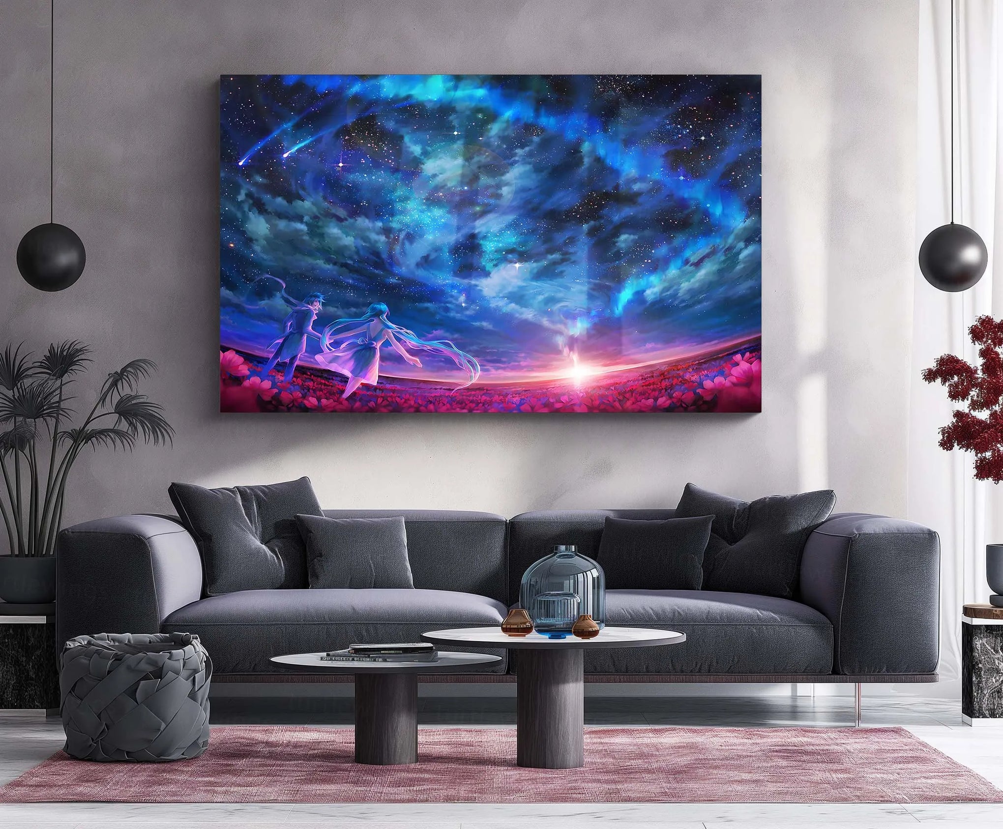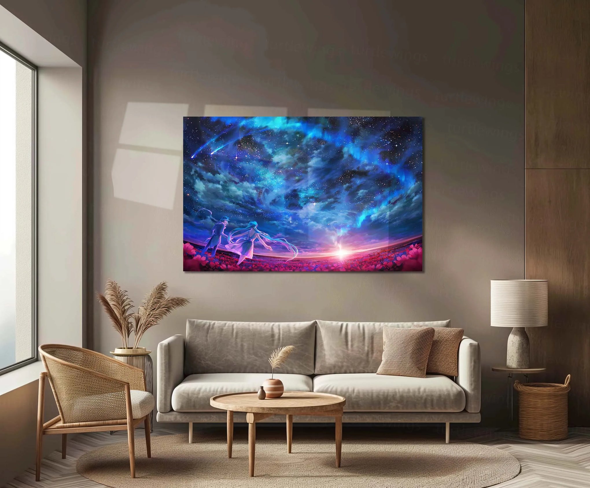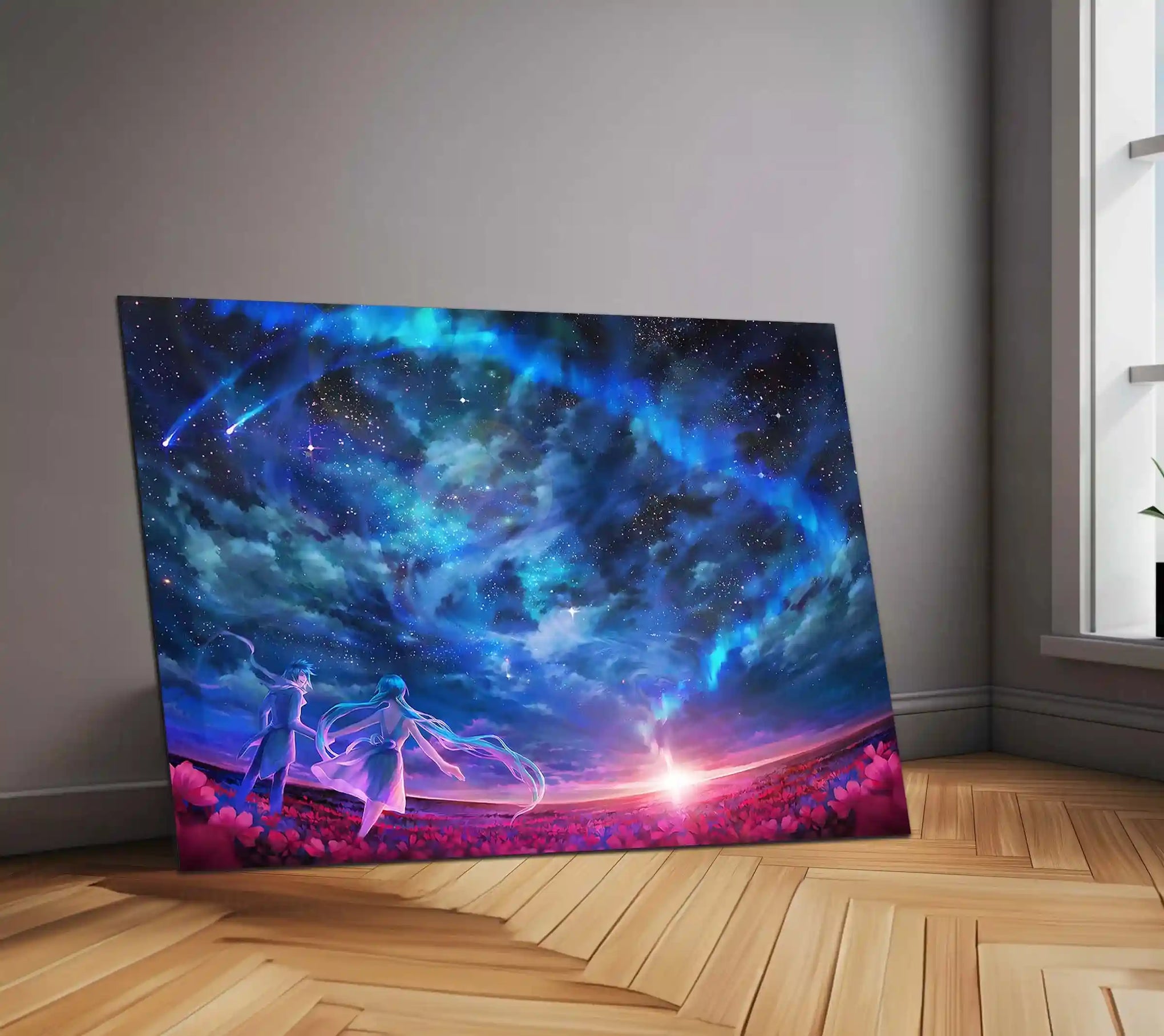 galaxy couple wall art, romantic celestial poster, fantasy night sky metal print, couple under stars wall decor, dreamy anime-style wall poster, turtlewings romantic artwork