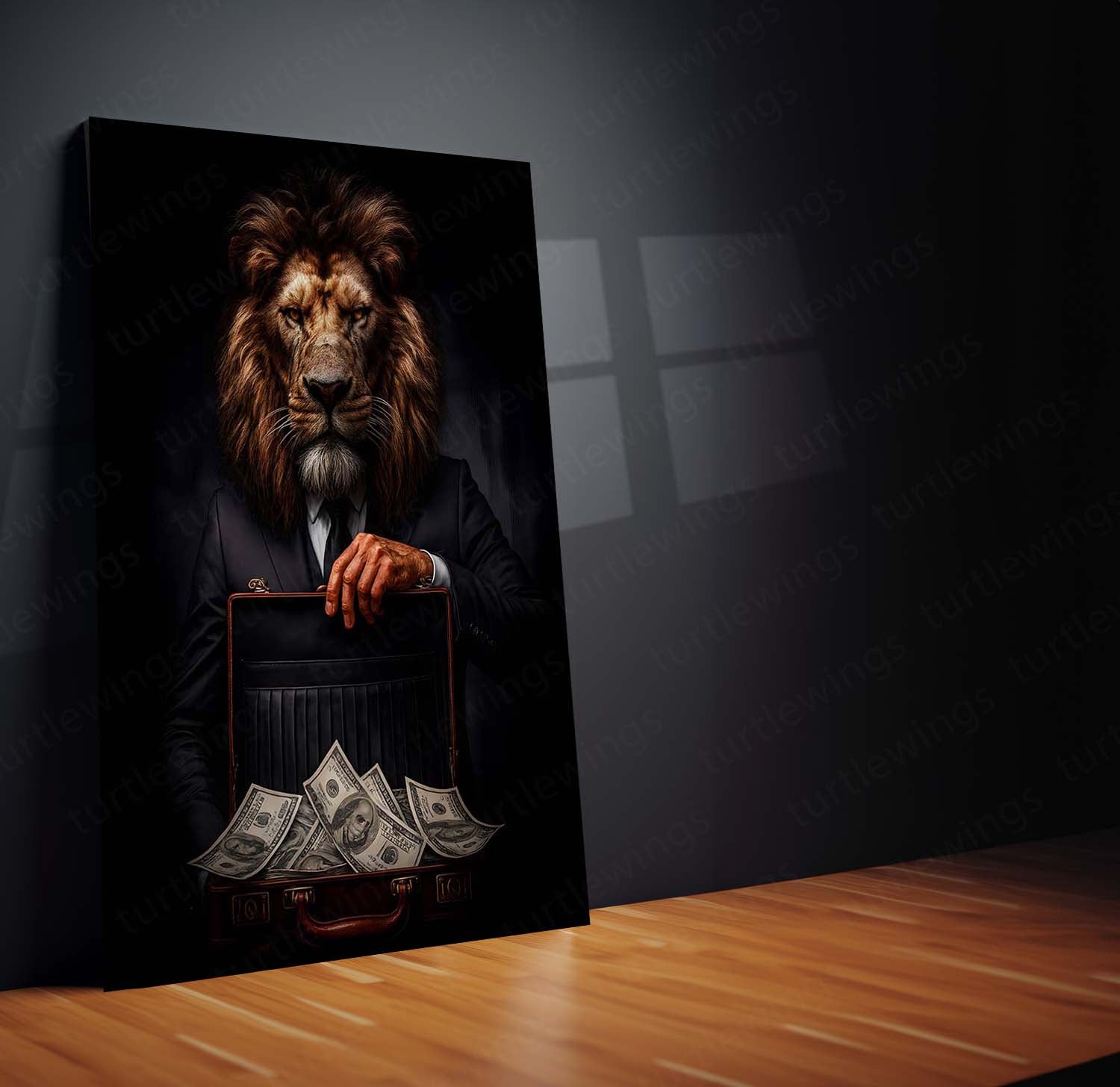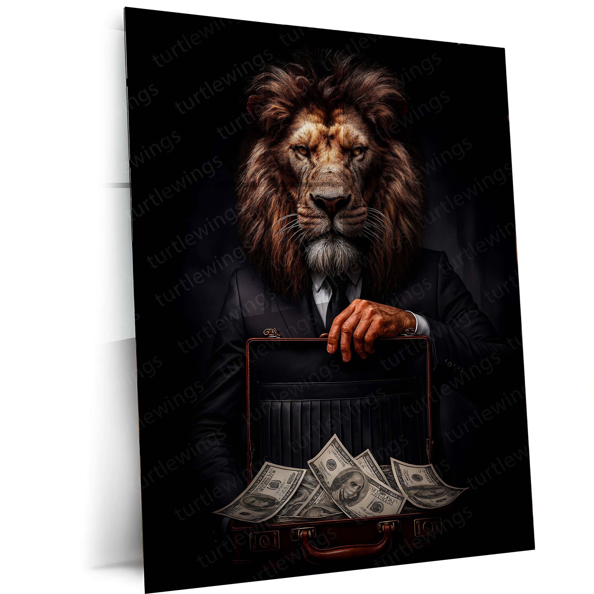 lion in suit poster, royal wall art, luxury office decor, motivational metal frame, animal portrait wall art, power and confidence poster, modern king artwork, lion business art, alpha wall frame, luxury metal decor