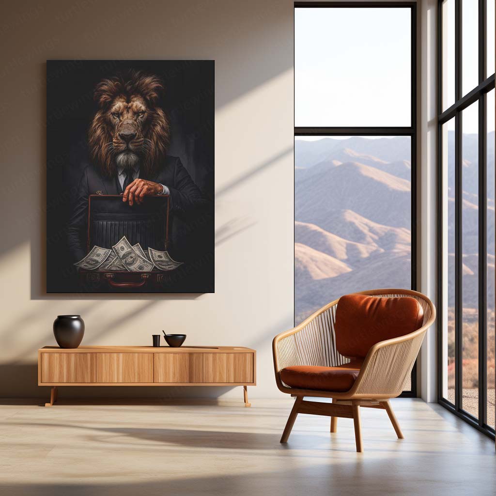Symbolizing leadership, courage, and dominance, this artwork captures the essence of a modern gentleman with the soul of a king. The lion, dressed in a sleek tailored suit, embodies confidence and authority — making it a perfect statement piece for offices, studios, or luxury interiors.