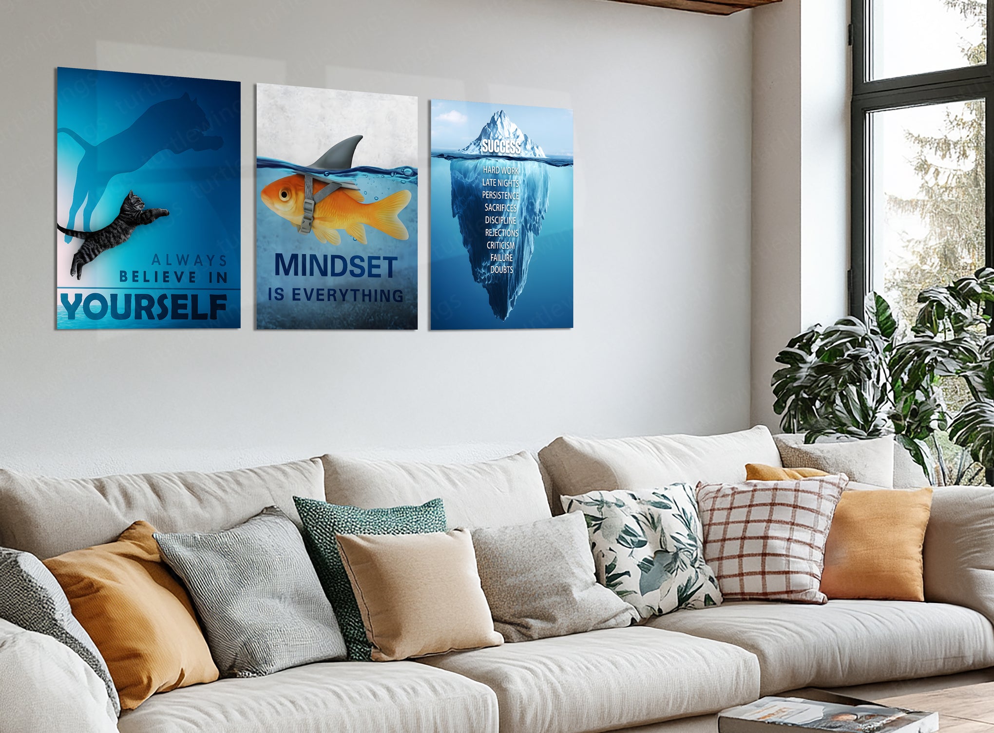 Transform your space into a hub of focus, drive, and inspiration with this Motivational Metal Poster Set of 3Yourself, Mindset, and Success.