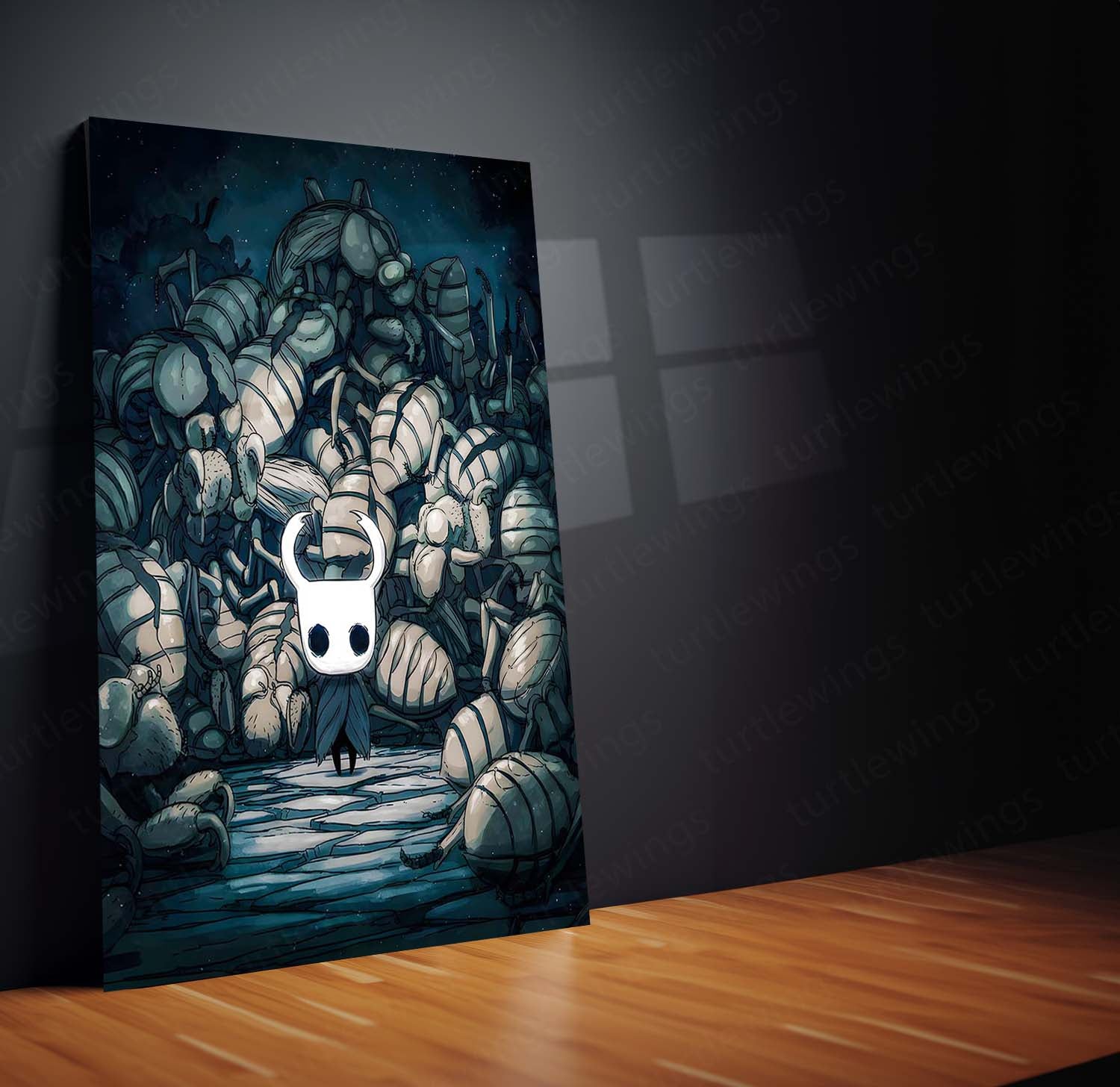 hollow knight metal poster, indie game wall art, cinematic gaming decor, knight slayer artwork, hallownest poster, dark fantasy art print, minimalist game frame, hollow knight wall decor, gaming collectible metal frame, turtlewings game series