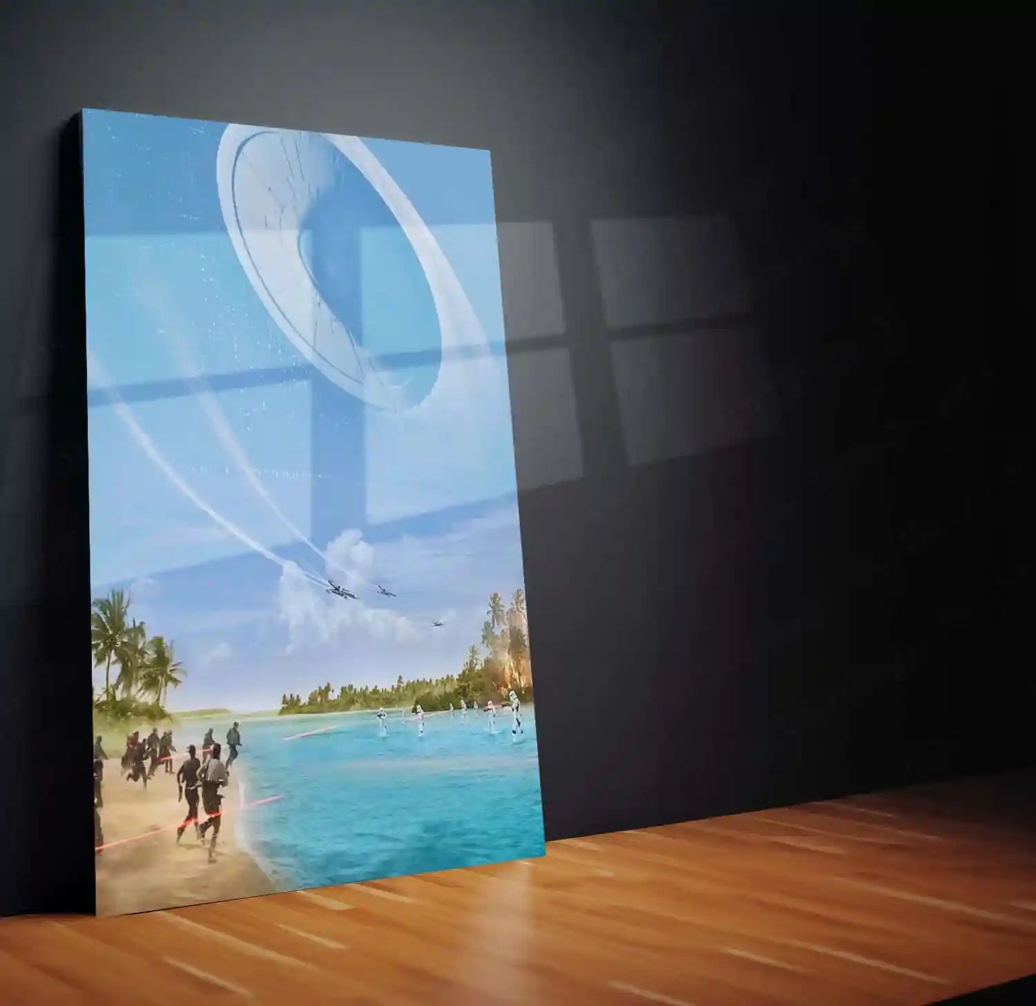 This stunning artwork captures an iconic battle scene across beaches, oceans, and skies — complete with X-Wings, Stormtroopers, and the overwhelming presence of a colossal starship above.