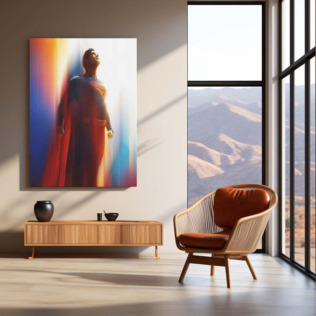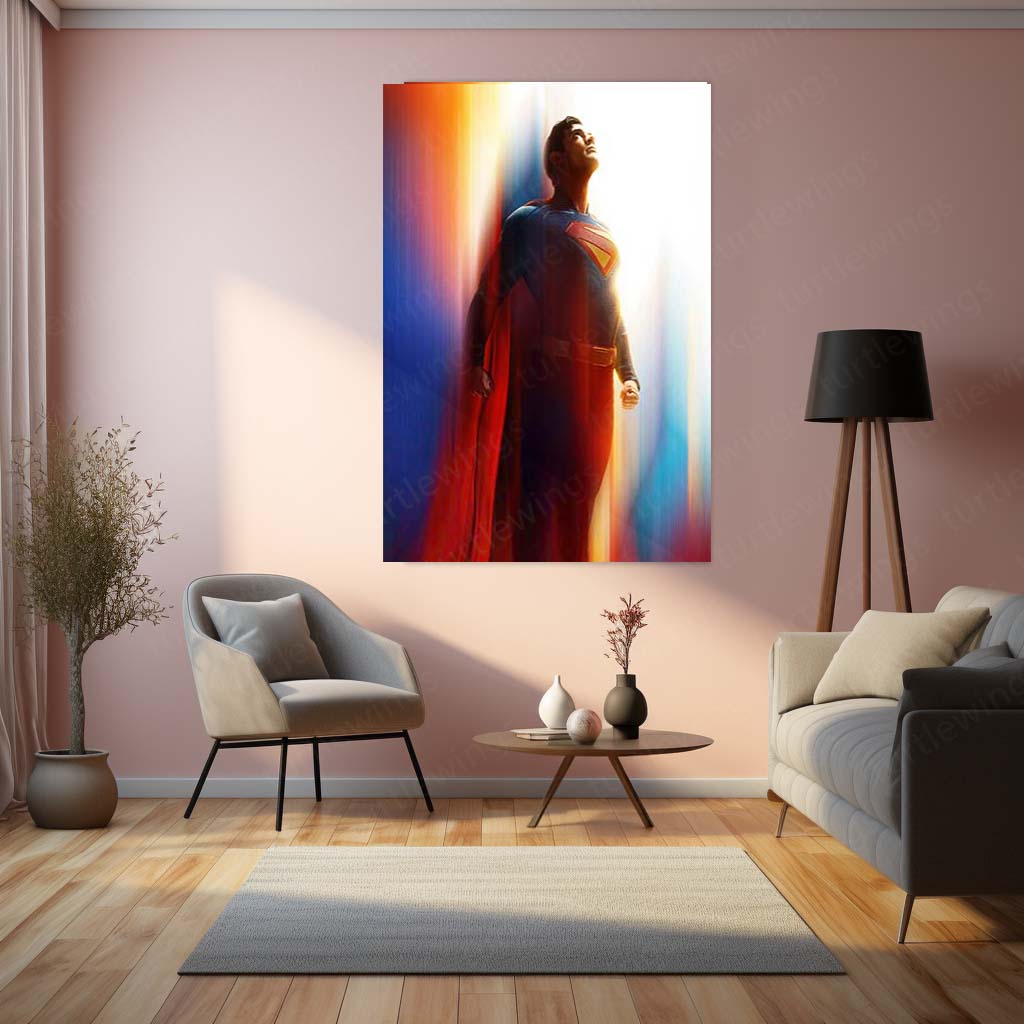 Featuring Clark Kent as the Man of Steel in his iconic red cape and “S” shield, this artwork radiates hope, justice, and unwavering strength.