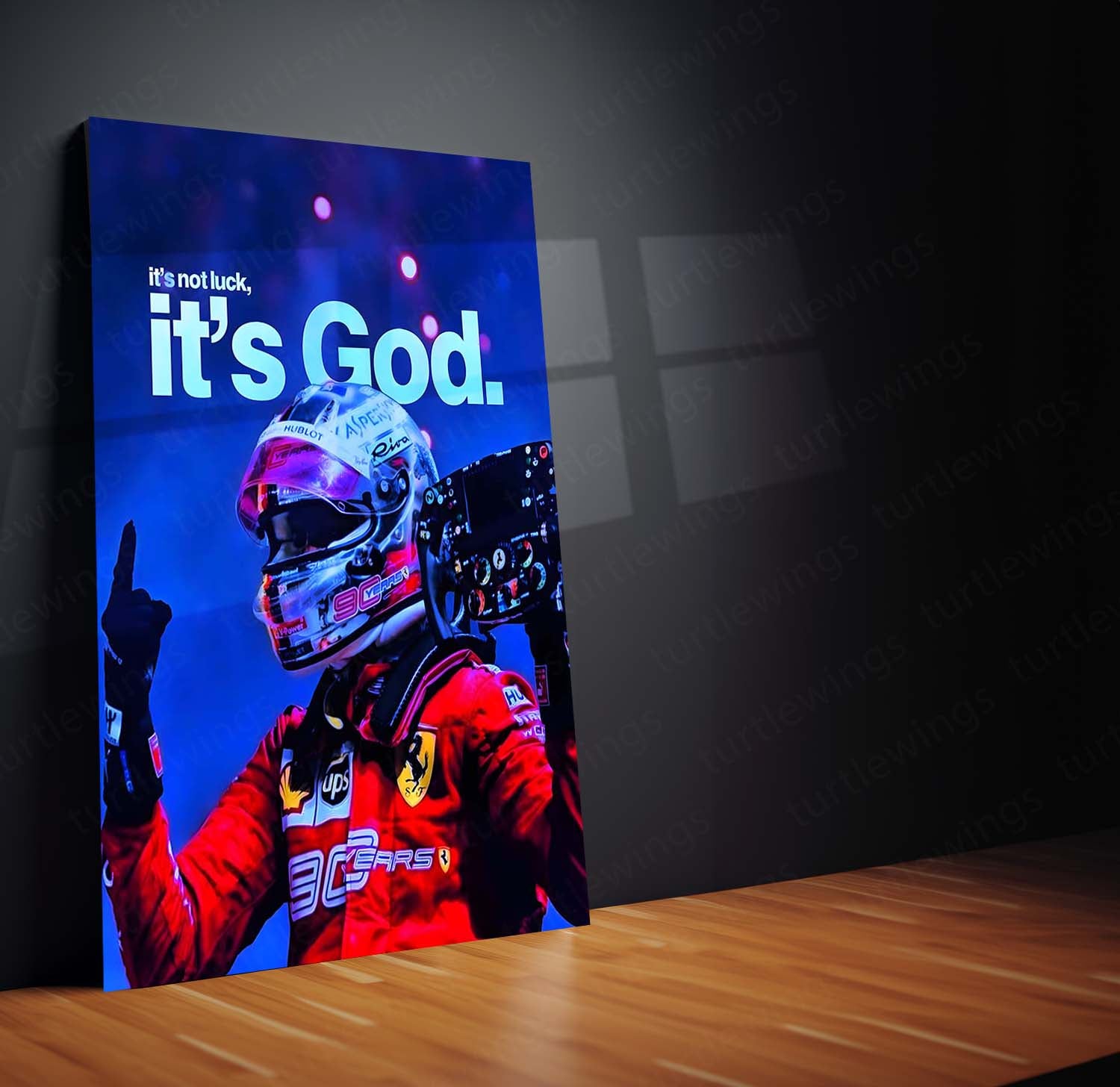 charles leclerc metal poster, it’s not luck it’s god wall art, f1 faith mindset poster, formula 1 motivation metal frame, ferrari racing quote decor, turtlewings metal print
