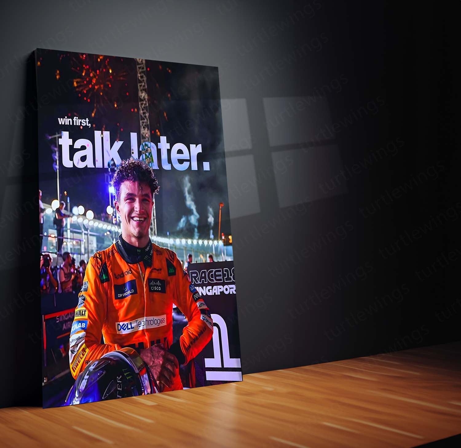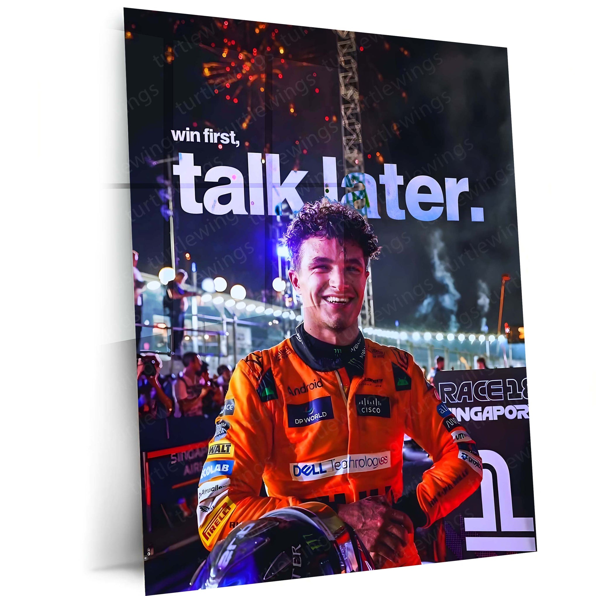 “Win First, Talk Later” is a mindset built for those who let outcomes speak louder than opinions. Inspired by Lando Norris’ fearless rise and race-day composure, this artwork celebrates the power of focus, performance, and quiet dominance.