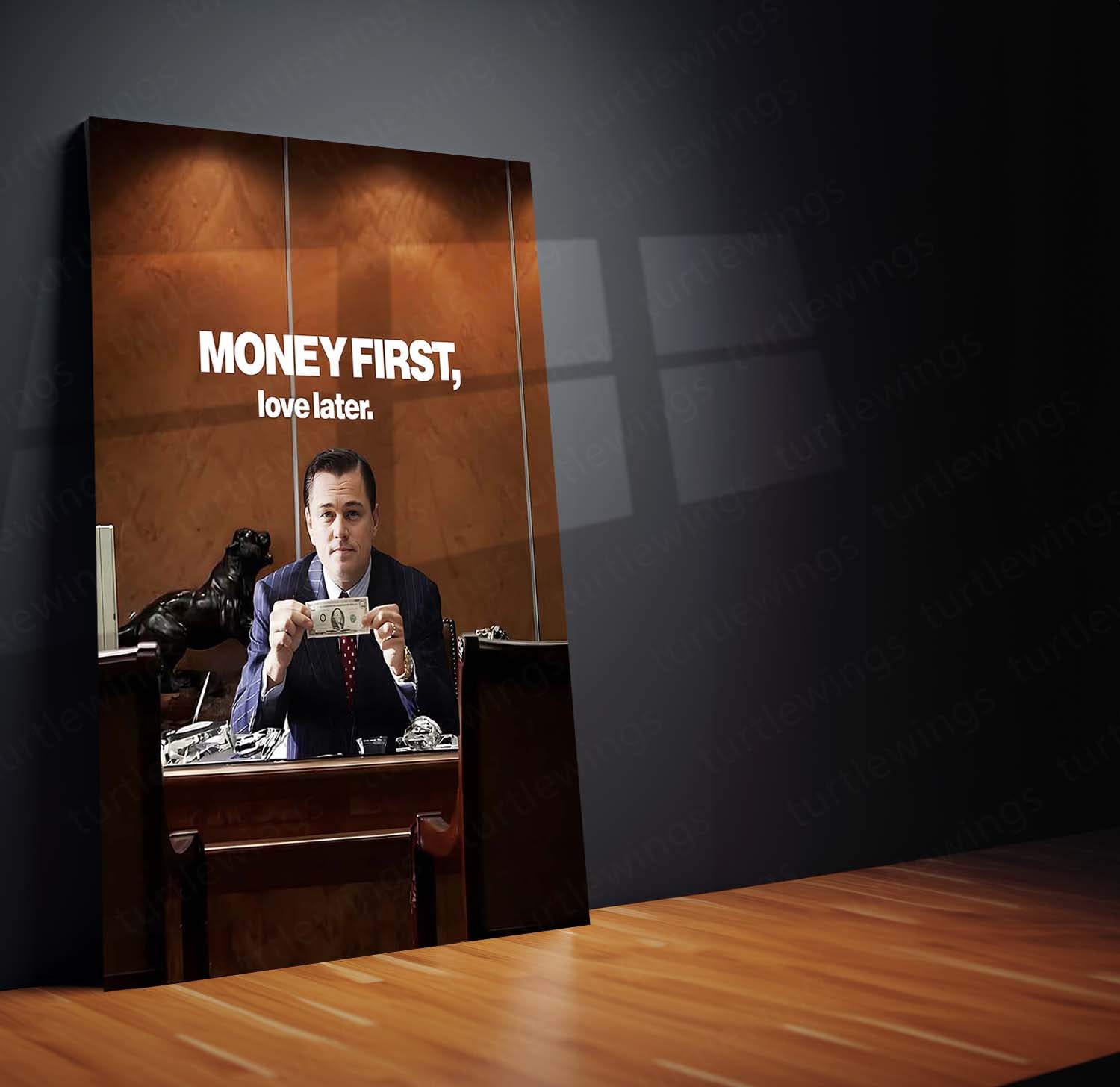 money first love later metal poster, leonardo dicaprio wall art, wealth mindset metal frame, hustler quote decor, success discipline poster, turtlewings metal print