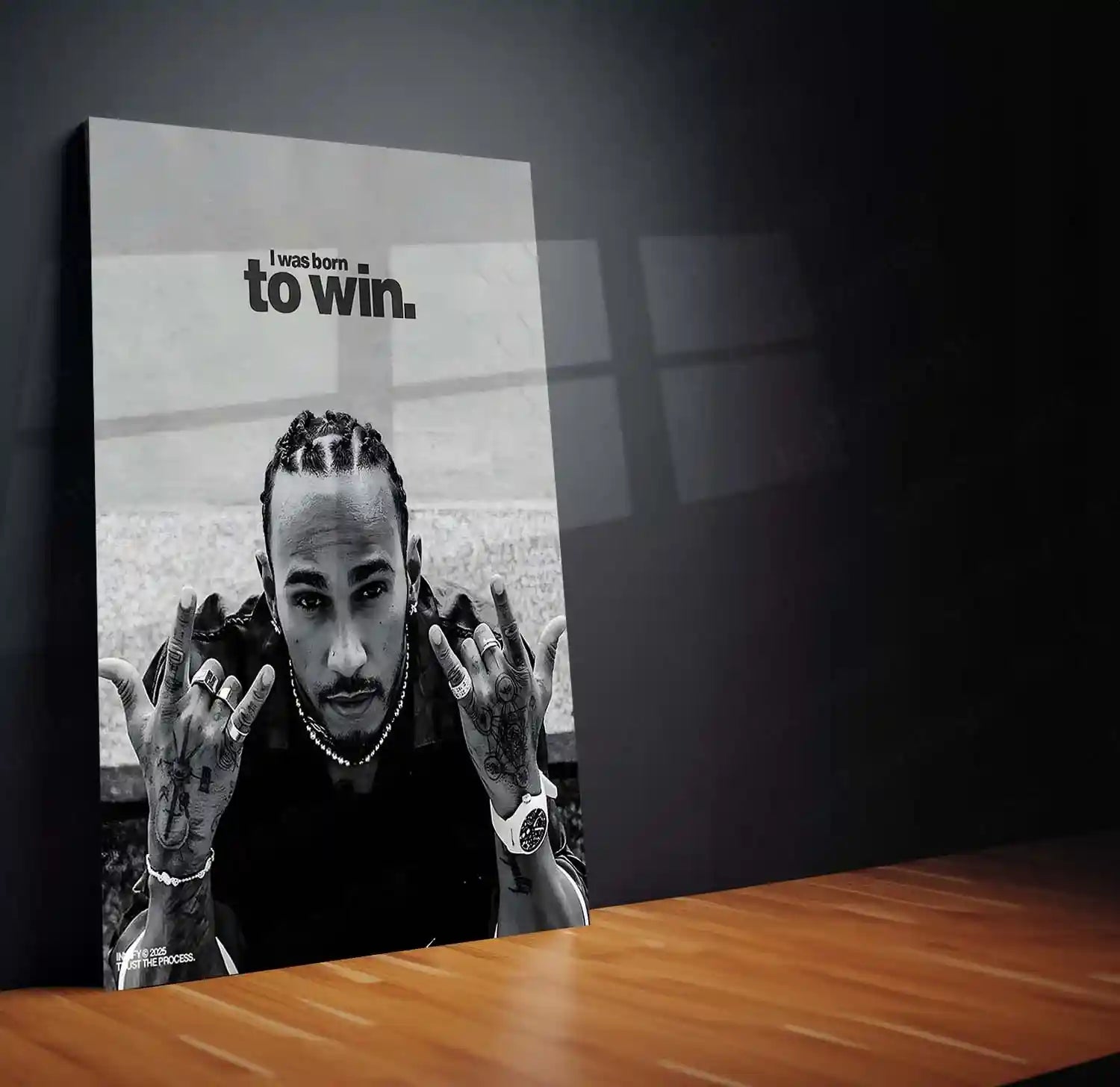 This Lewis Hamilton “I Was Born to Win” Metal Frame embodies the power, attitude, and focus of one of Formula 1’s greatest legends. With a sharp monochrome portrait and bold typography, it captures the essence of Hamilton’s unshakable confidence and competitive spirit.