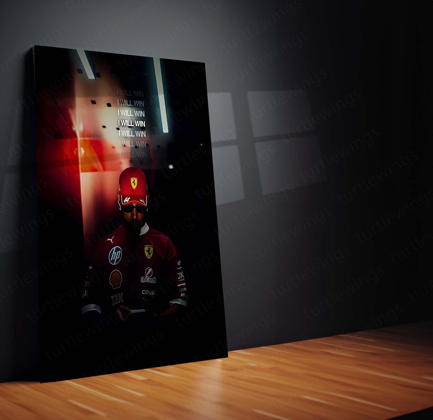 The “I Will Win” metal frame captures Lewis Hamilton in his most powerful mental state — silent, focused, and absolutely certain of the outcome.