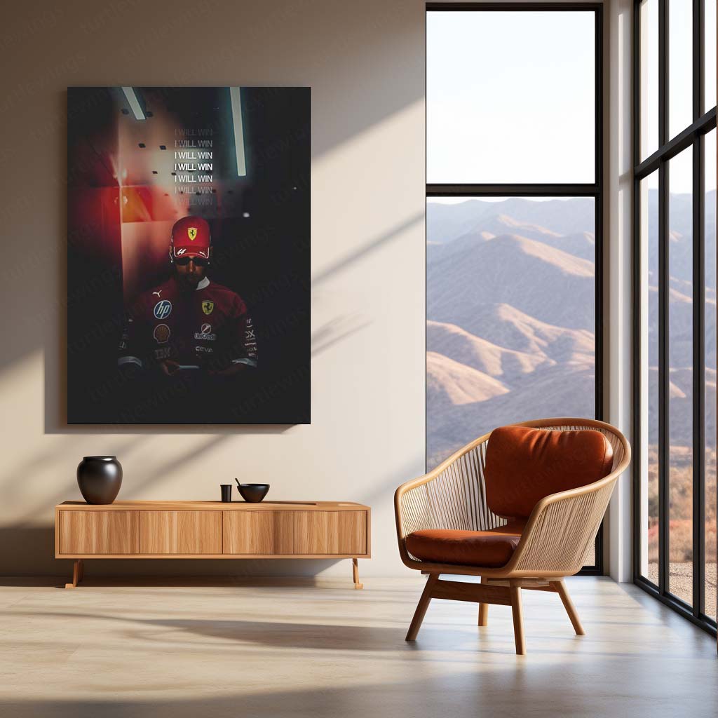 This artwork represents the psychology of champions: when winning isn’t hope, it’s a decision. Hamilton’s posture, shadows, and repetition of the words I WILL WIN reflect relentless self-belief, discipline, and inner dominance long before results appear.