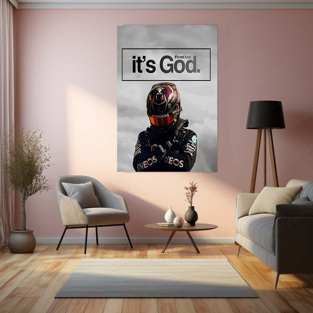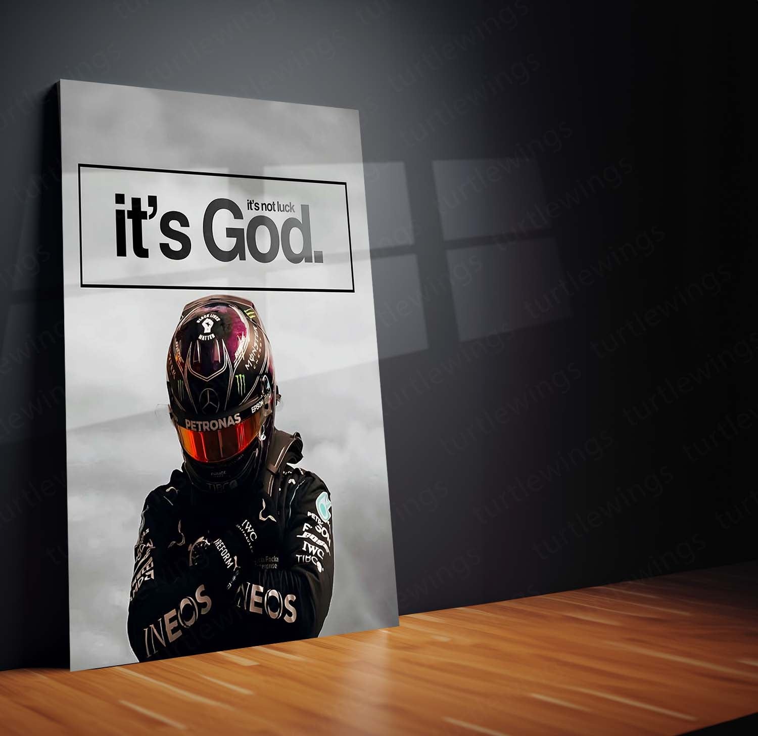lewis hamilton metal poster, it’s not luck it’s god quote, formula 1 faith wall art, f1 mindset metal frame, championship belief poster, racing motivation decor, turtlewings metal print