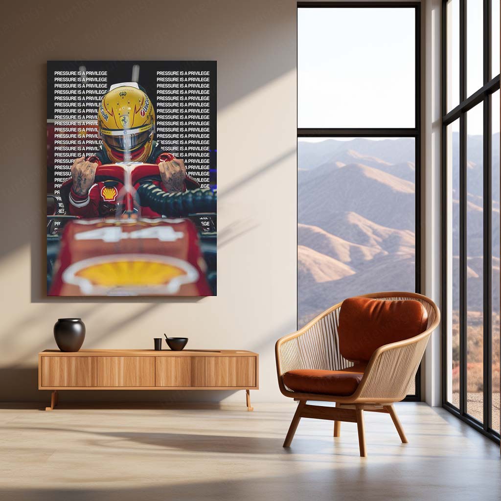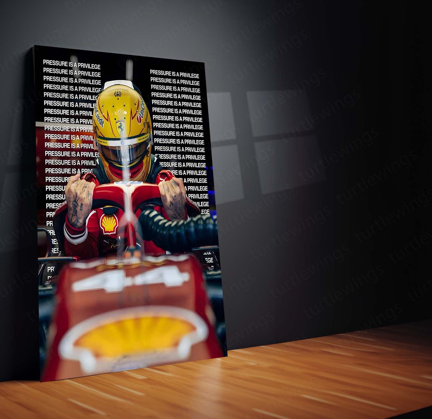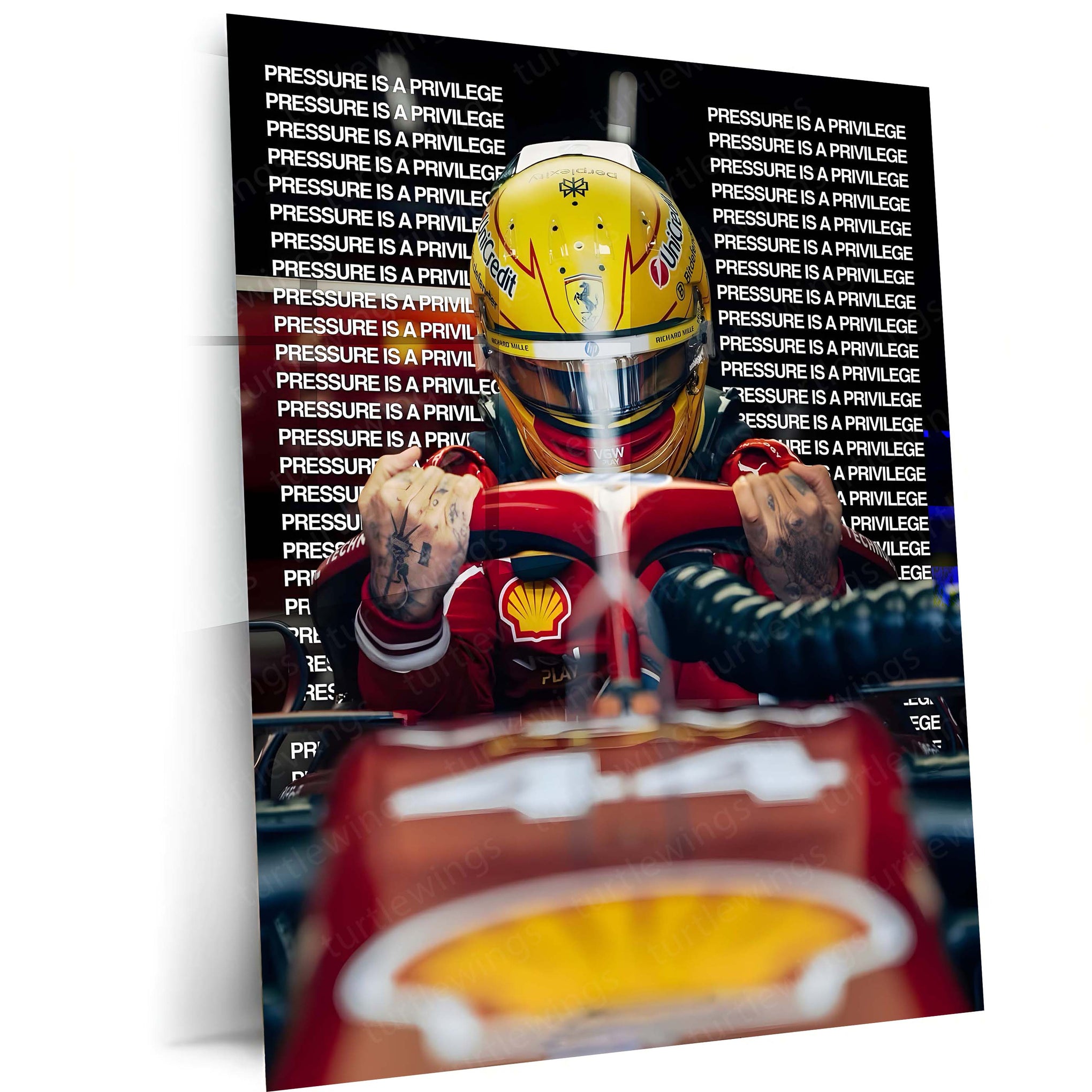 The Pressure Is a Privilege metal frame captures Lewis Hamilton’s elite Formula 1 mindset — where expectation isn’t a burden, but proof that you belong at the top.