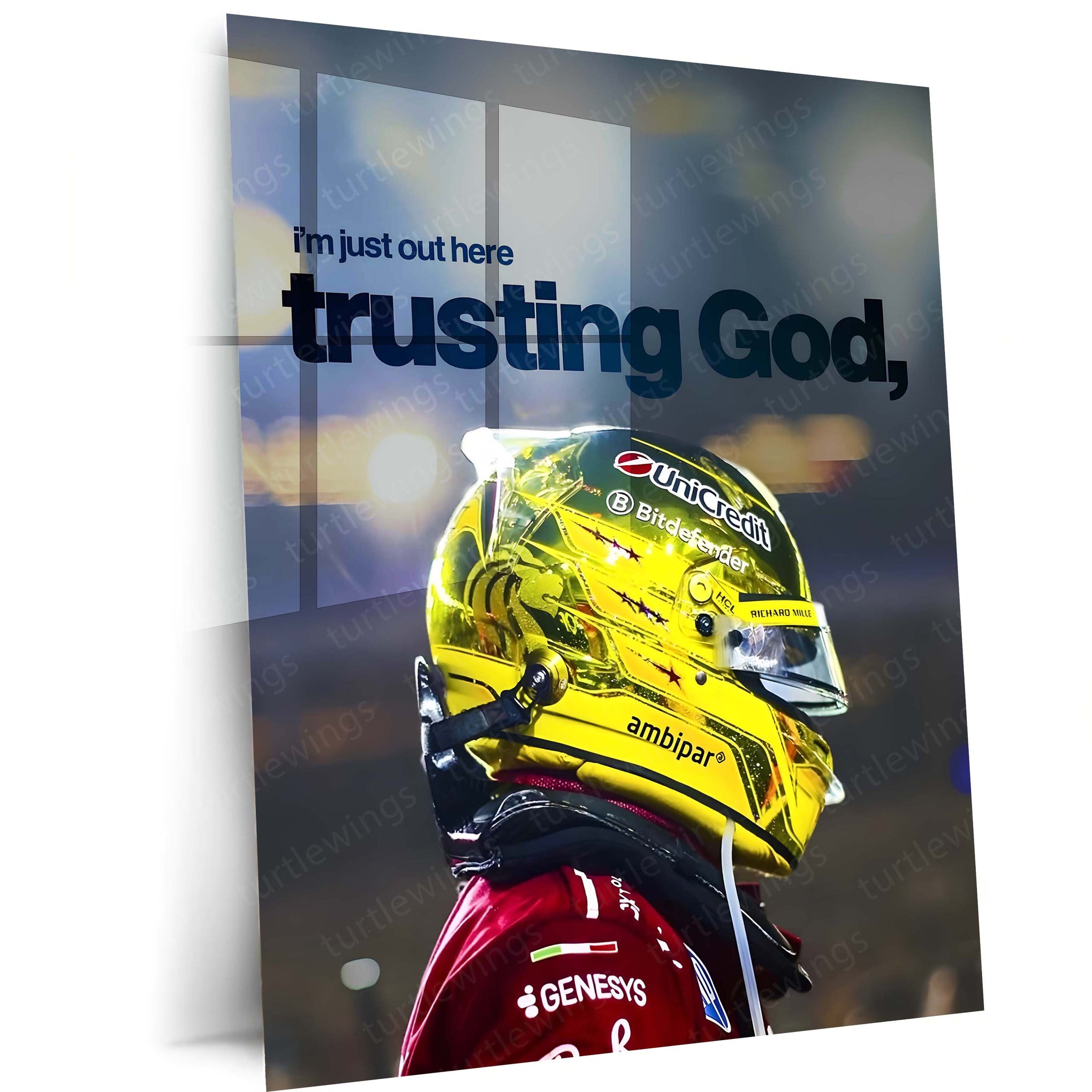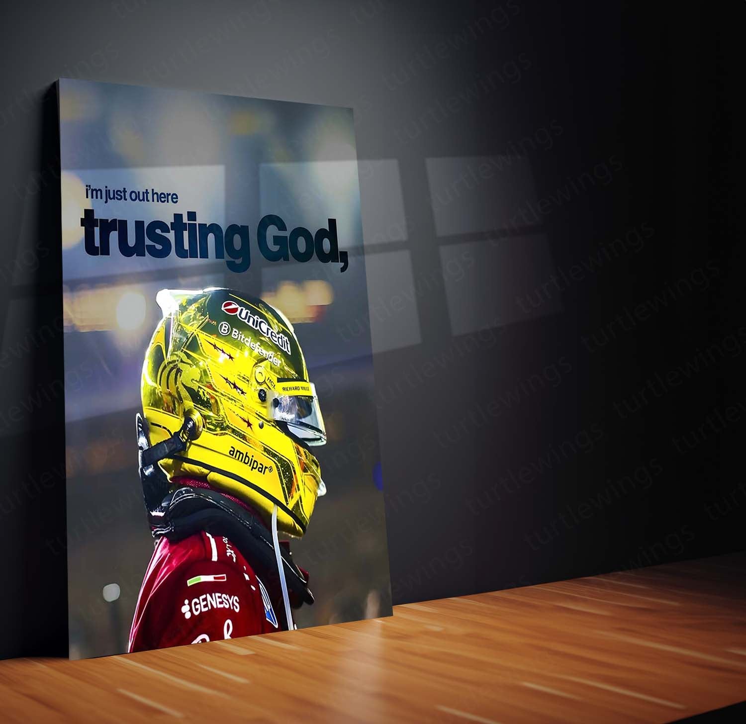 Quote Metal Poster | Lewis Hamilton – Trusting God’s Timing Metal Frame Faith, Patience & Inner Peace Wall Art | Confidence Quote Metal Poster