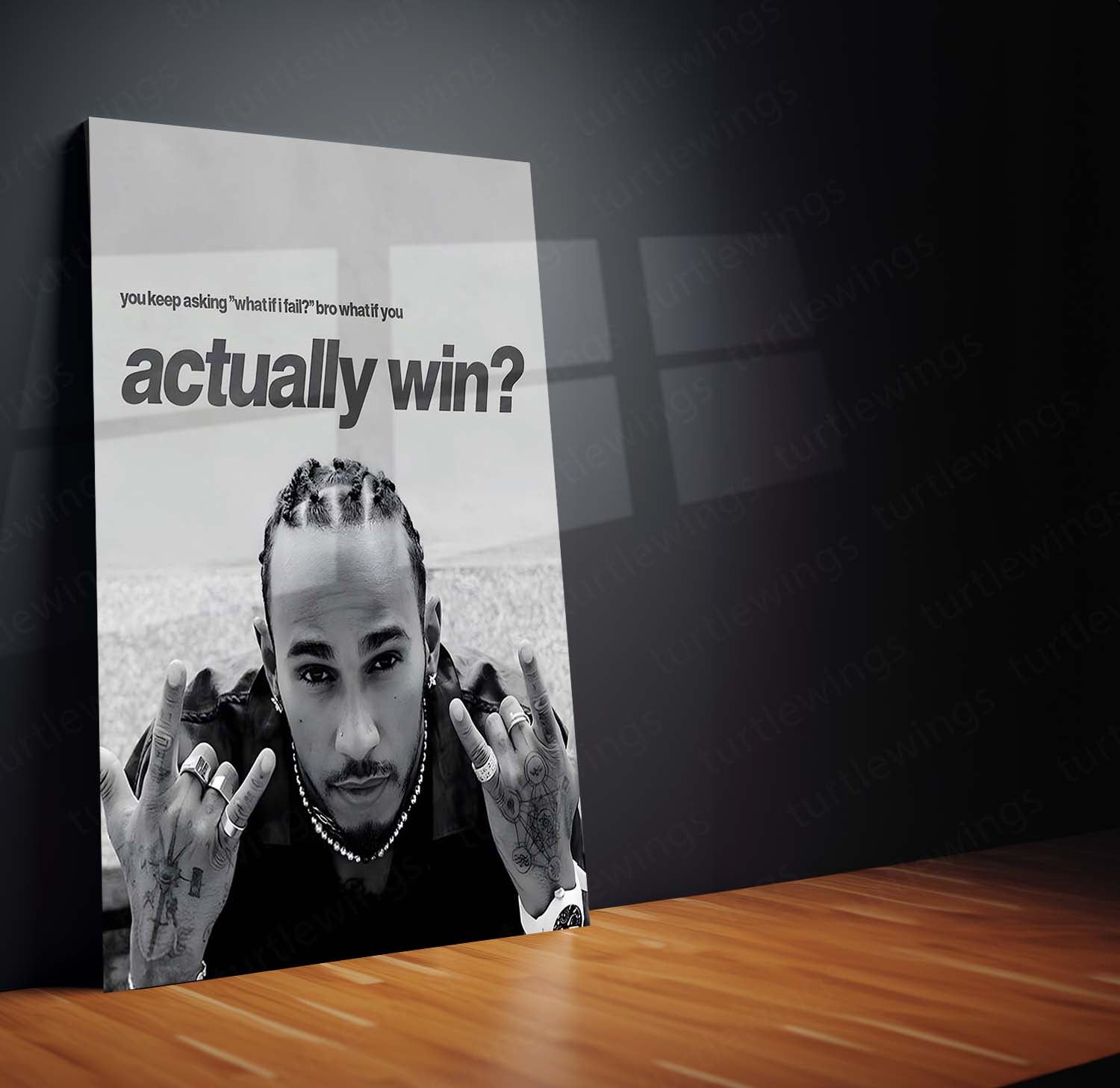 lewis hamilton poster, what if you win quote, motivational wall art metal frame, fear mindset poster, winning mentality wall decor, f1 inspiration poster, turtlewings metal print india