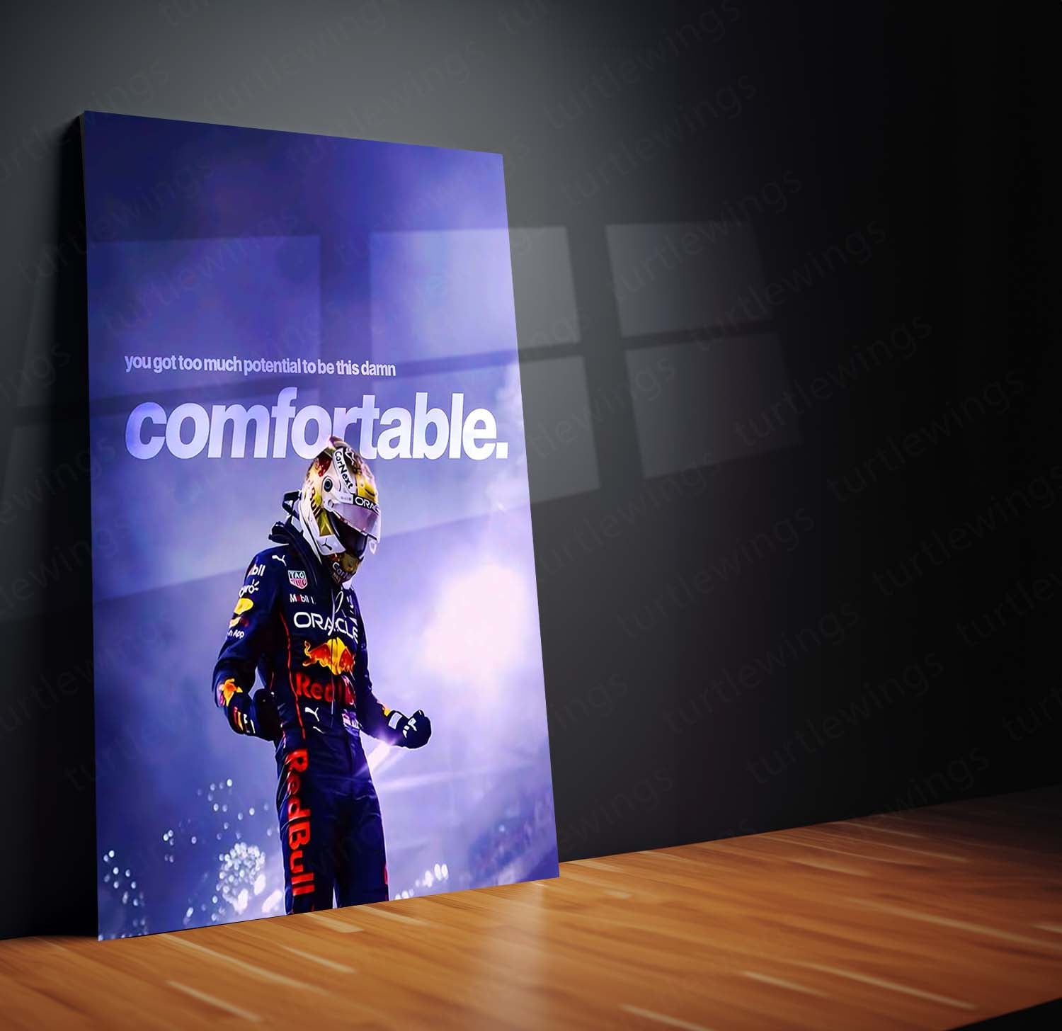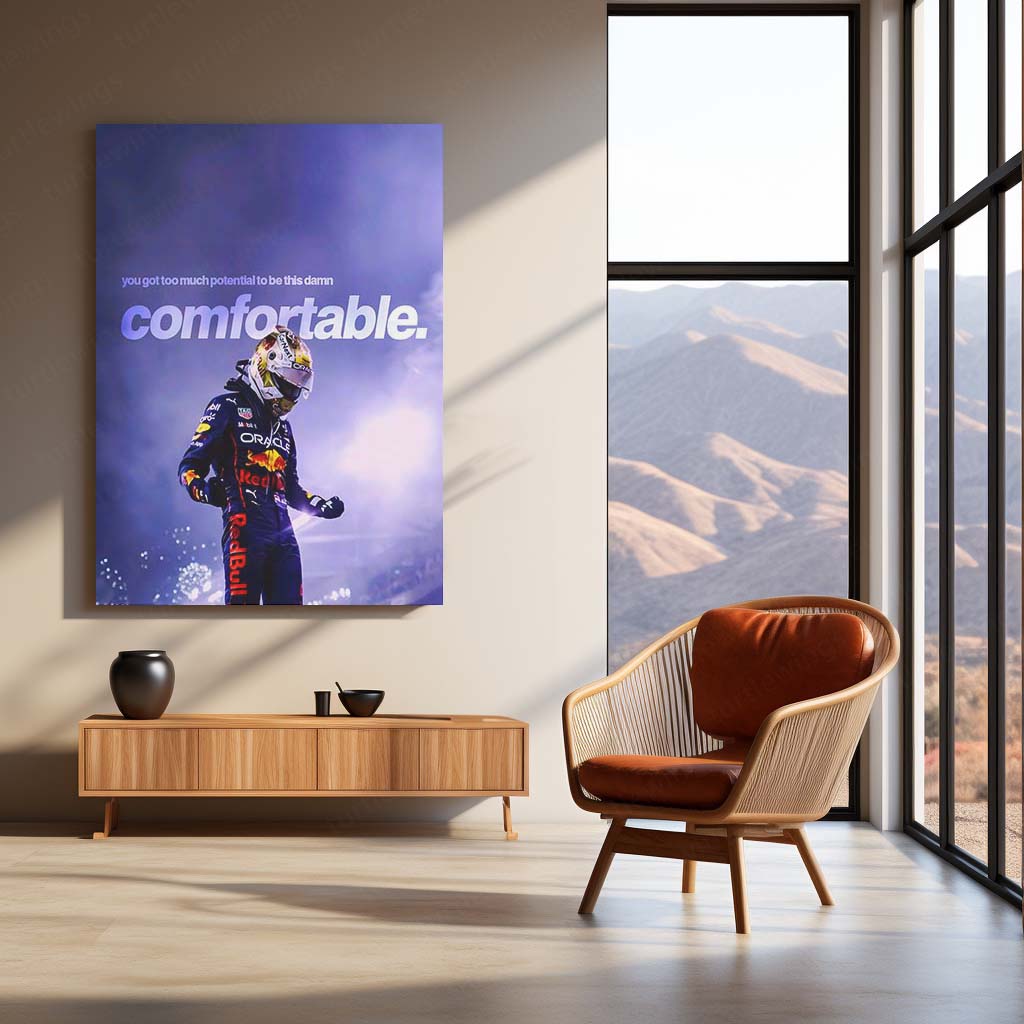 max verstappen poster, too much potential quote, f1 champion mindset wall art, uncomfortable growth motivation poster, red bull racing metal frame, turtlewings metal print india
