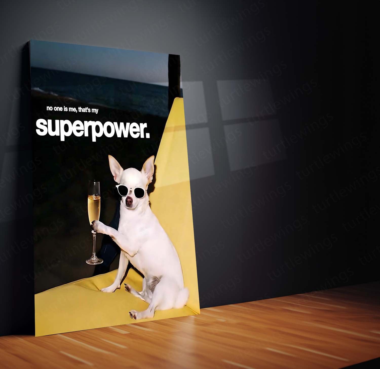 The My Superpower Metal Frame is a celebration of self-confidence, individuality, and unapologetic uniqueness. Featuring a stylish pup with sunglasses and a champagne glass, this artwork blends humor, attitude, and modern luxury aesthetics into one statement piece.