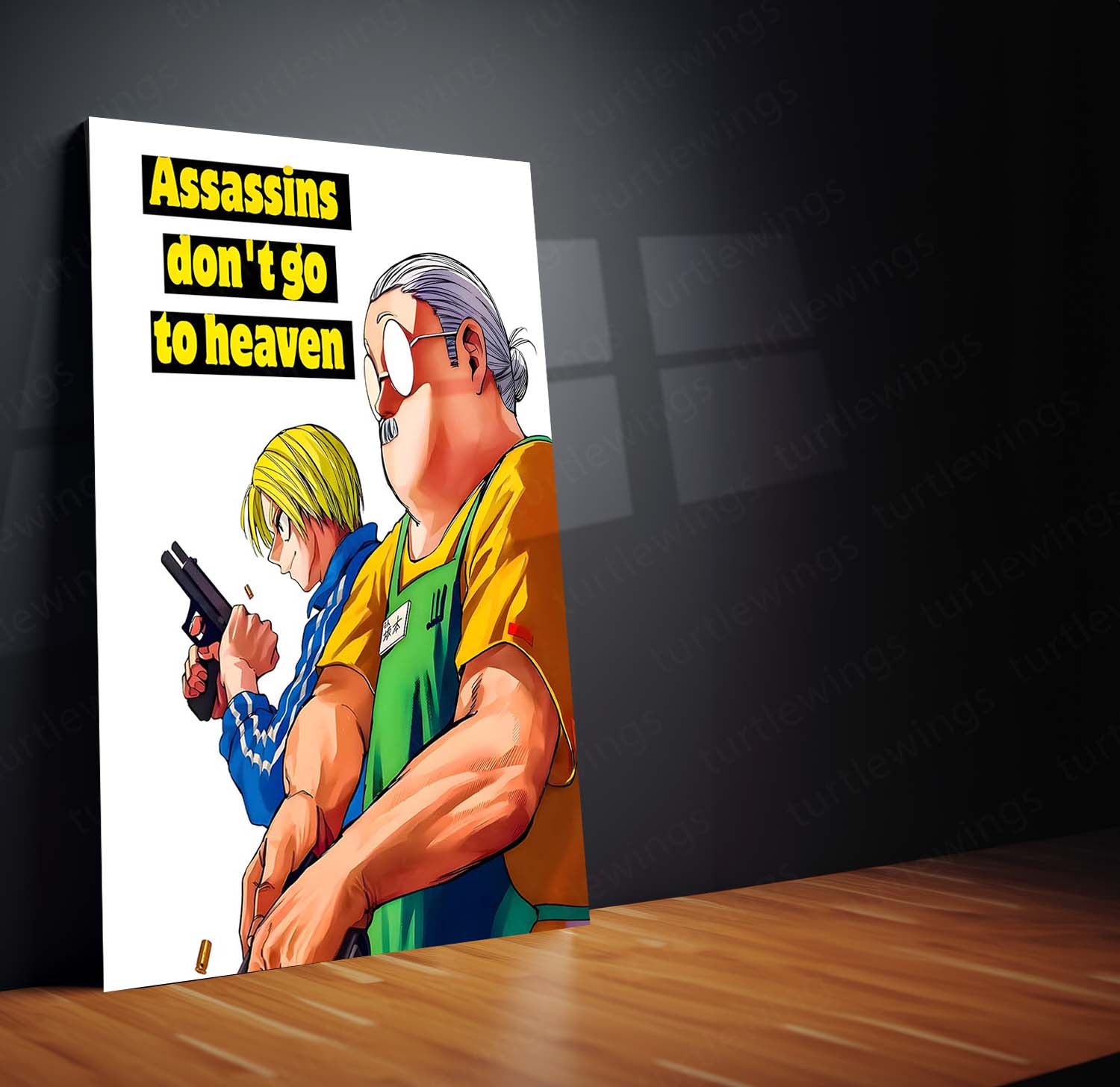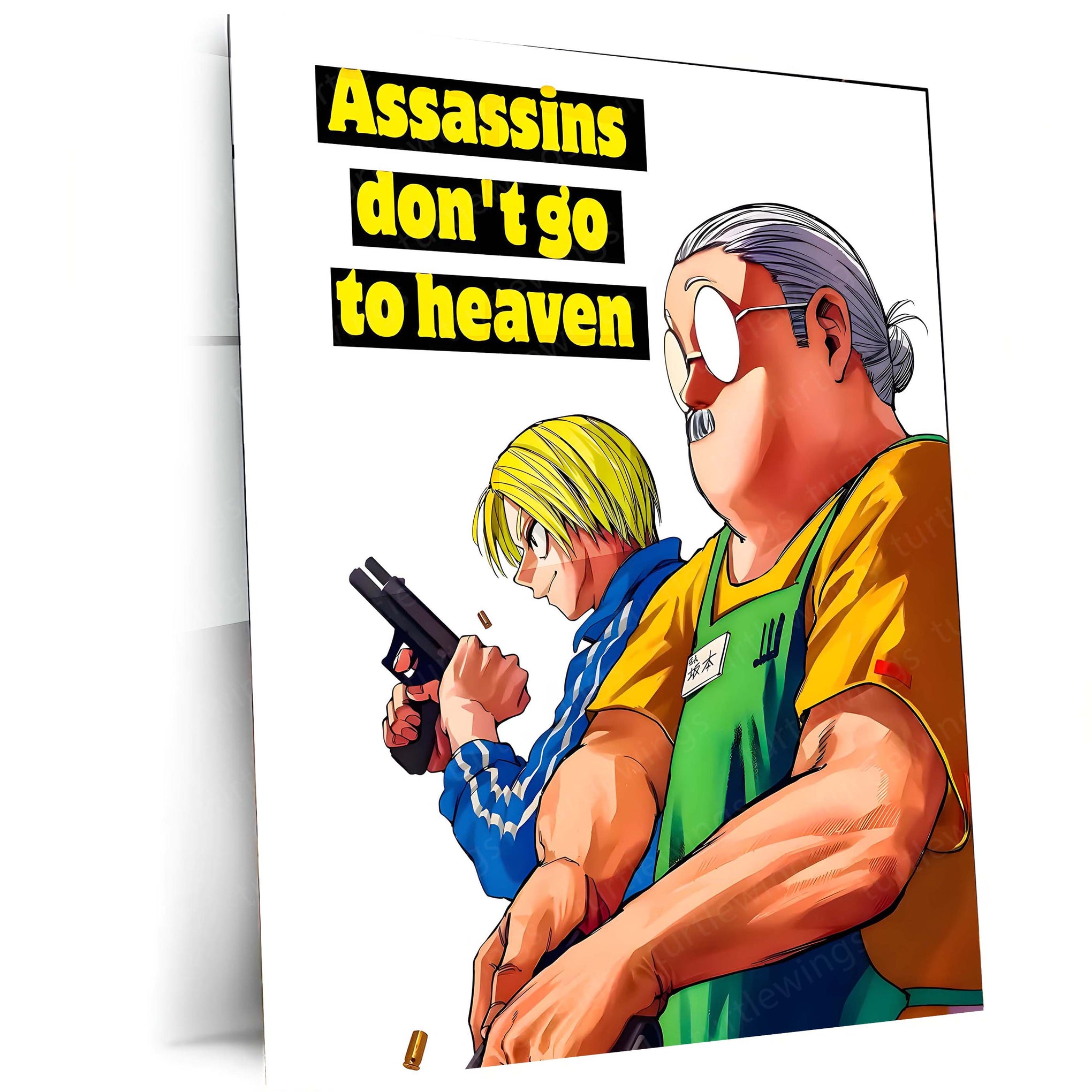 This artwork features Taro Sakamoto and his partner Shin in a sharp, comic-style illustration alongside the unforgettable quote — “Assassins don’t go to heaven.”
