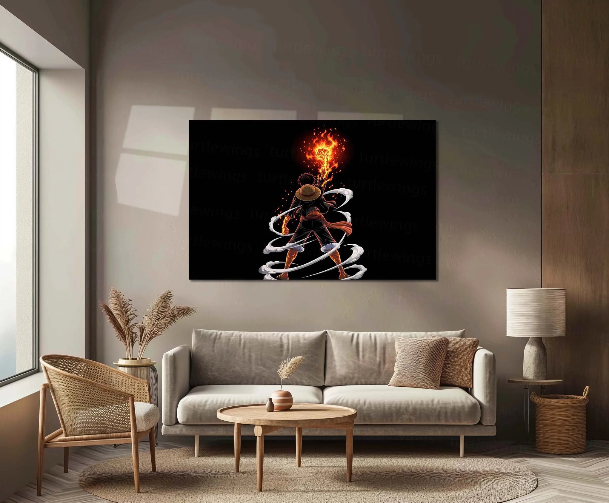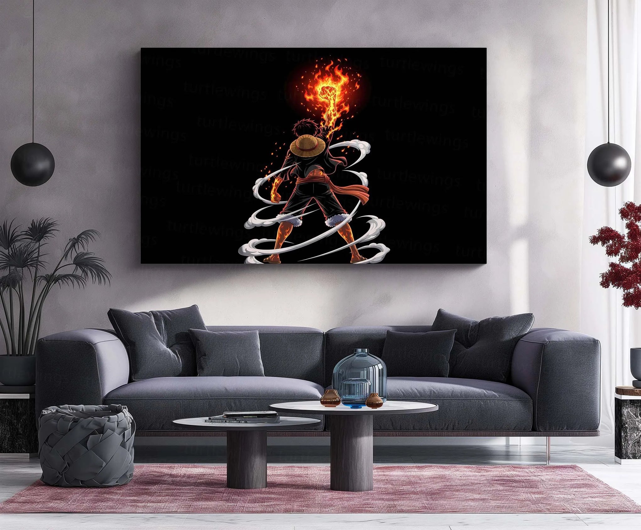 one piece luffy artwork, pirate king wall art, anime power poster, luffy fire fist art
