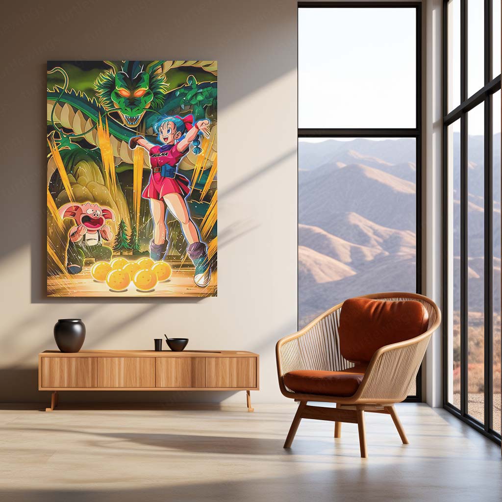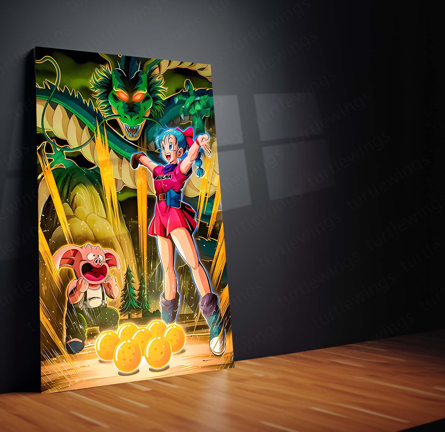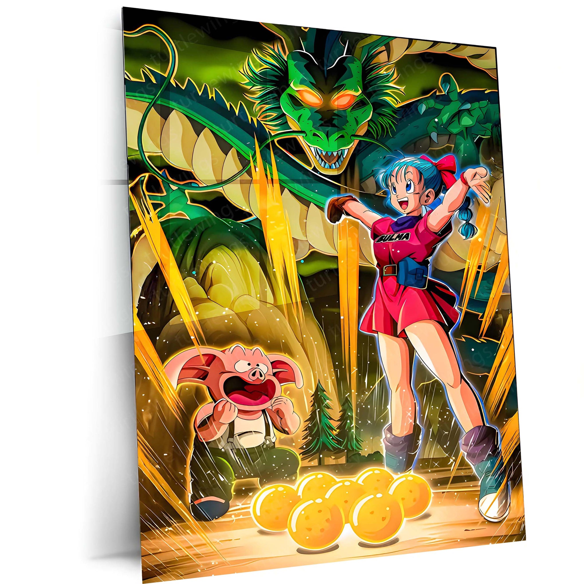 Celebrate the adventurous beginnings of Dragon Ball with this Bulma Collecting Dragon Ball Metal Frame Poster — a nostalgic tribute to the genius, charm, and curiosity that started it all.