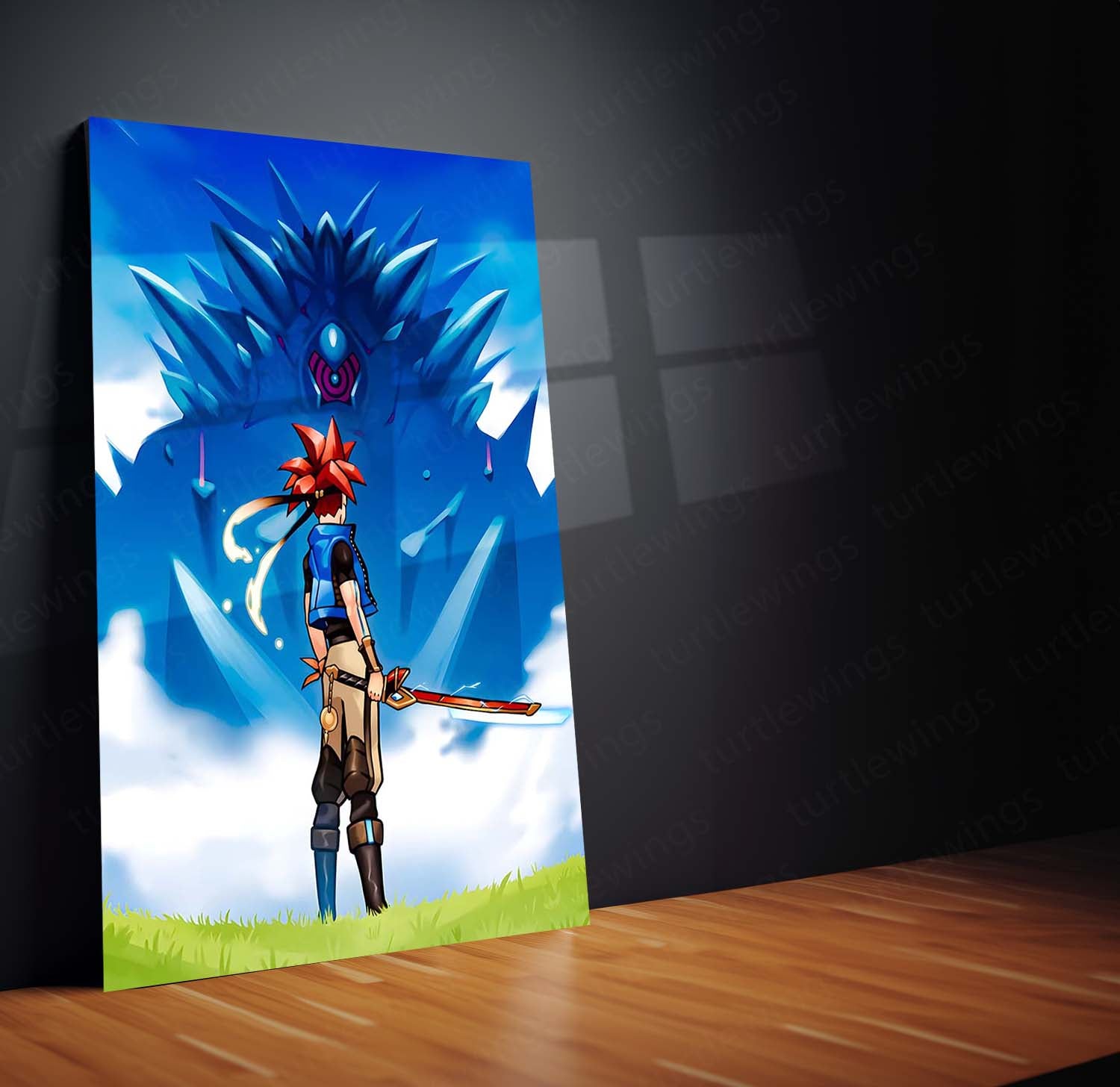 chrono x xeno poster, sci-fi metal frame, futuristic wall art, cyberpunk poster, neon time traveler art, techno-fantasy decor, digital rift artwork, modern metal print, anime sci-fi wall art, time portal design