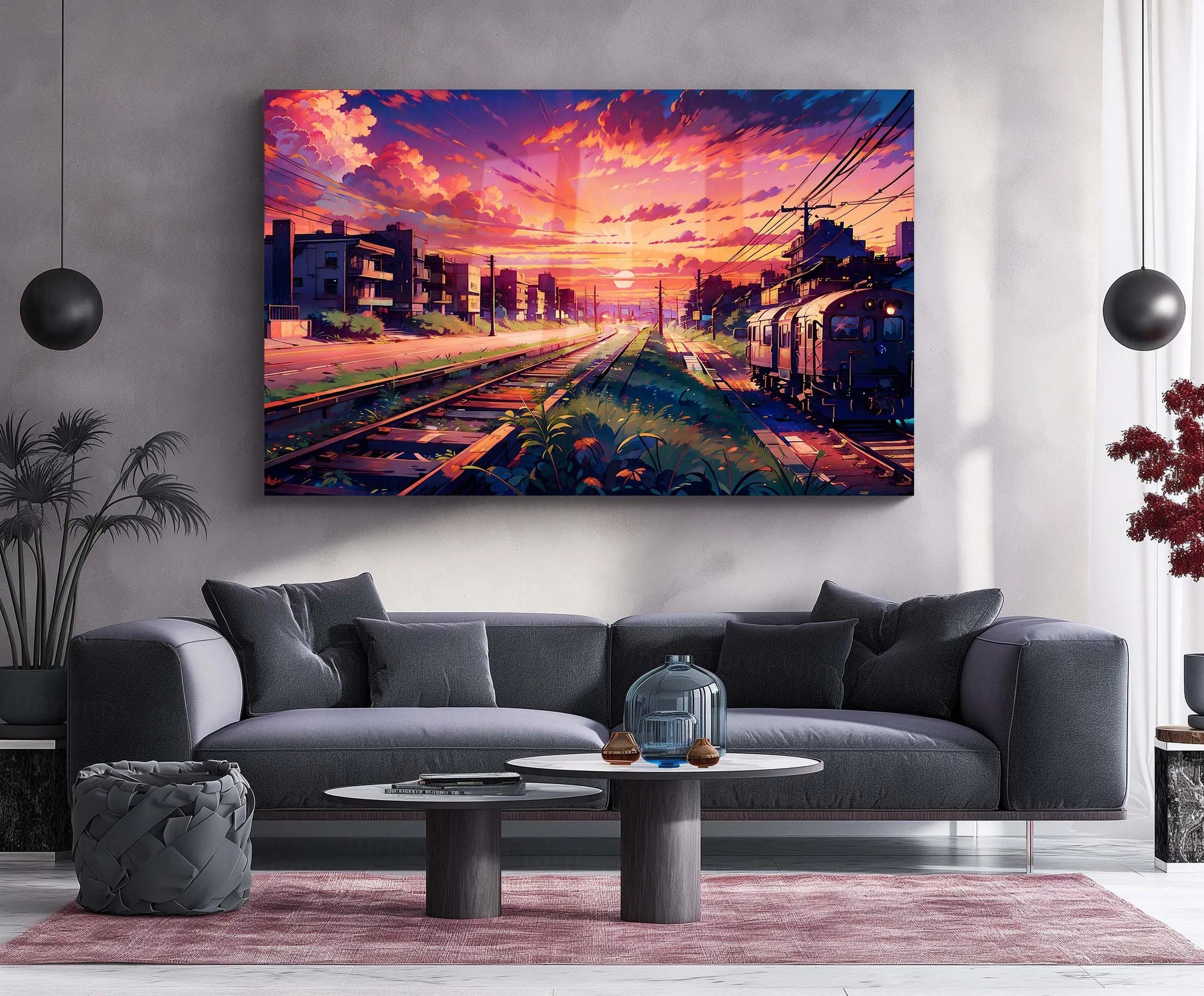 Inspired by anime-style cityscapes, this piece captures the golden glow of the sun setting over urban train lines — a perfect fusion of nostalgia, peace, and wanderlust.